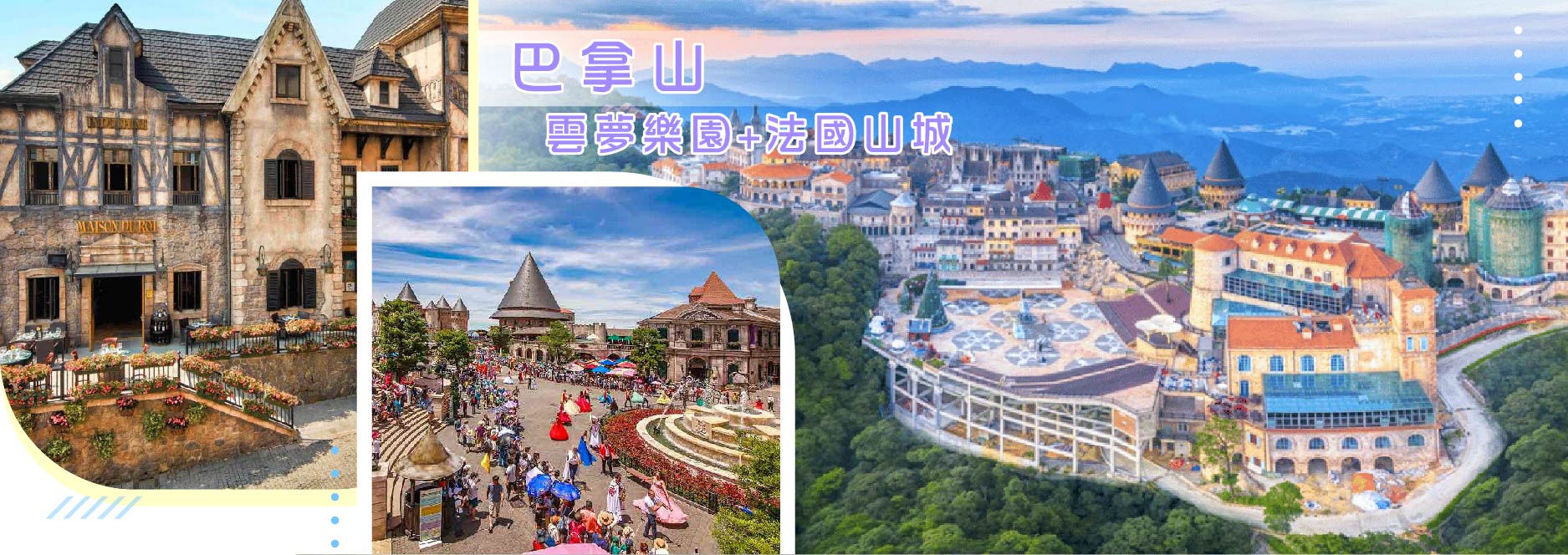 法國春天山城之美譽【巴拿山】(BaNa Hills)位於峴港以西40公里處,早期法國殖民時代中,海拔1487米,氣溫長年較山下低6℃至8℃,清涼又舒適。早於20世紀初,這裏已是法國人的避暑勝地,近年當地政府將巴拿山重新發展,打造成一個休閒度假區,在山上大興土木,不但建大佛、寺廟,還重修昔日法國人的酒窖,闢建室內機動遊樂場及大型空中城堡度假村等,儼如一個空中樂園。巴拿山登山纜車被 CNN 評為「世界最令人印象深刻的10條登山纜車之一」,擁有兩項金氏世界紀錄──世界最長的直達單軌登山纜車,最長的纜車路線長達5,801公尺,單程約達20分鐘;世界出發站及抵達站落差最大的纜車路線,落差高度約1,290公尺。