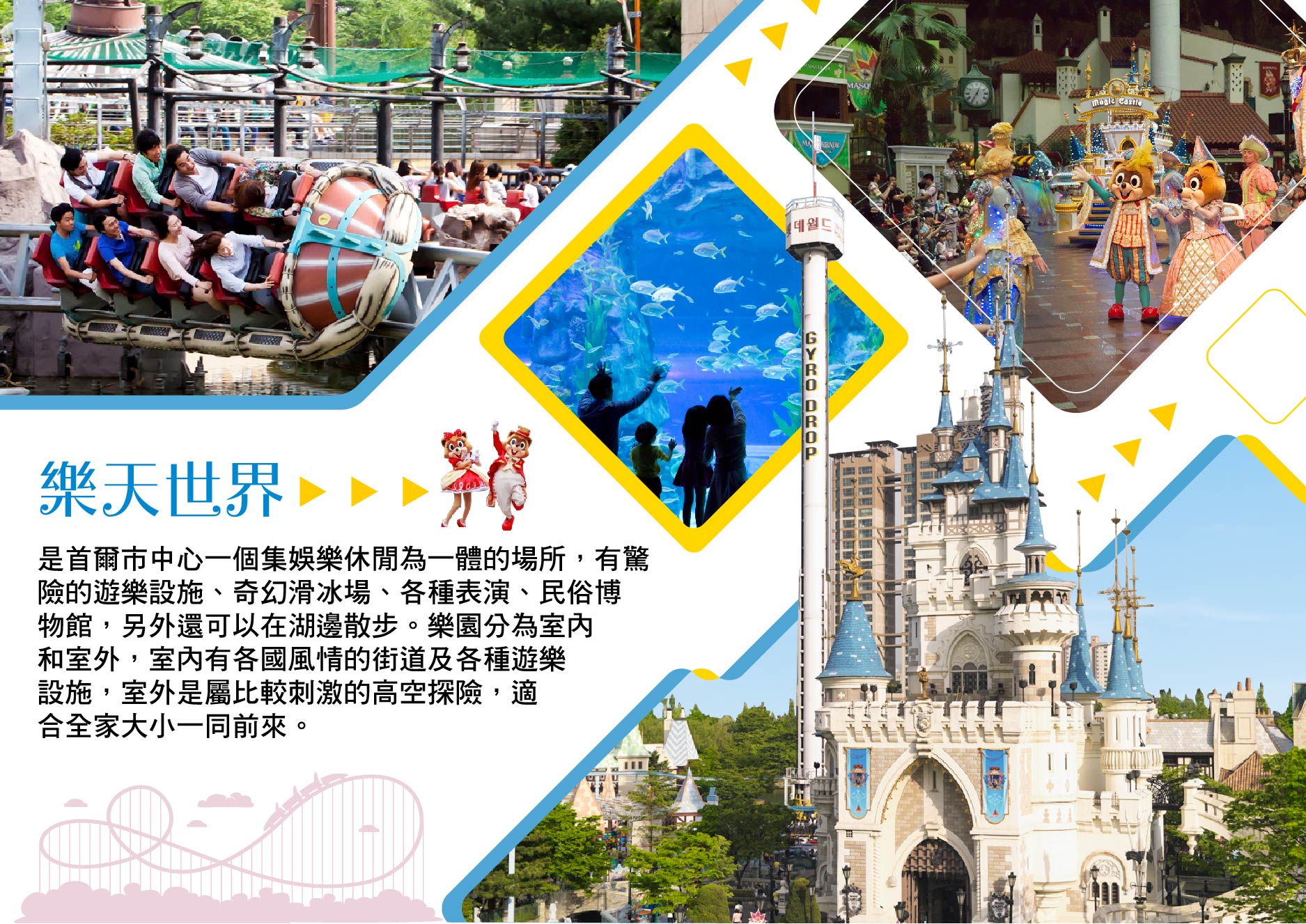 【樂天世界塔(外觀) +樂天世界(一票到底)】是一座集遊樂和文化內涵的超大型城市休閒遊樂園。裡面有世界最大室內主題樂園「驚險樂天世界」、漂浮湖水中的「魔術島」,以及超過30種尖端遊樂設備,供旅客盡情玩樂,五光十色的世界讓人回味無窮。此外,還有民俗館、劇場電影院、室內游泳池、滑冰場、保齡球場、會員制體育俱樂部、百貨公司和購物商店等非遊樂設施選擇。